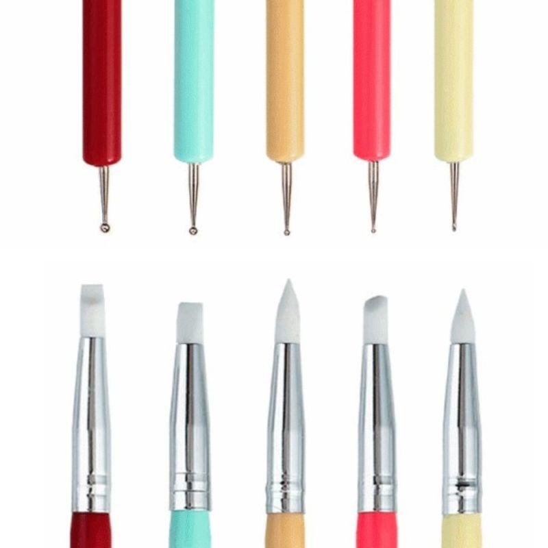 Σετ 5 διπλής όψης εργαλείων για nail art με πινέλα σιλικόνης και dot tools σε διάφορα μεγέθη. Κάθε εργαλείο διαθέτει από τη μία πλευρά λεπτή, εύκαμπτη σιλικονούχα μύτη, κατάλληλη για εφαρμογή gel, ακρυλικού, διόρθωση γραμμής γαλλικού και δημιουργία λεπτομερειών, ενώ η άλλη πλευρά διαθέτει εργαλεία για dotting tools , ιδανικά για διακοσμητικά σχέδια και nail art.